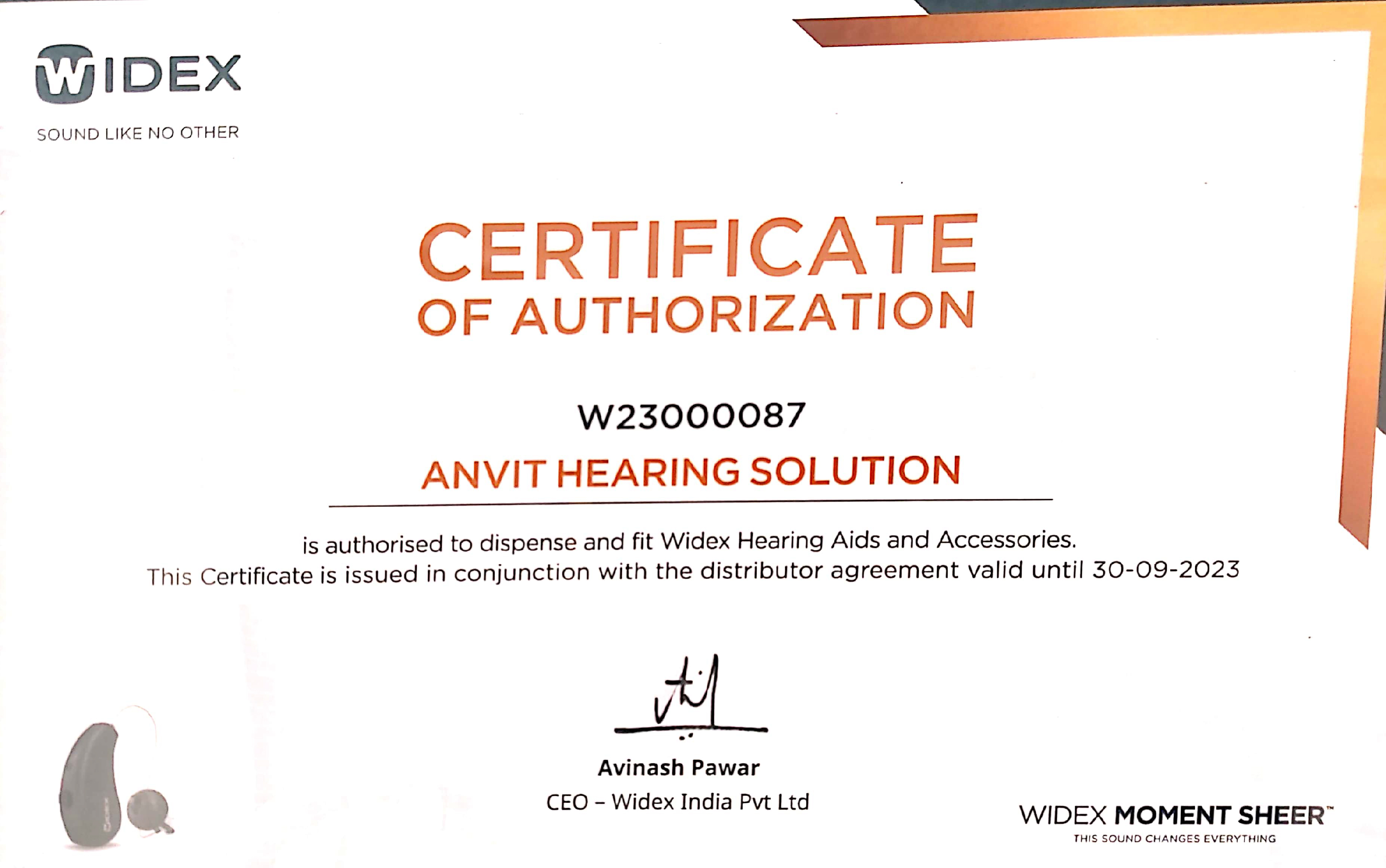 Widex Certificate of Authorization